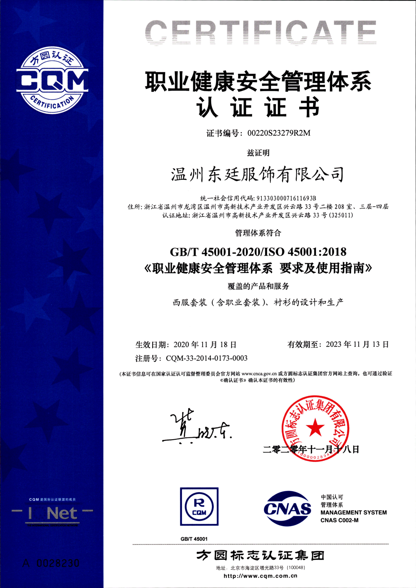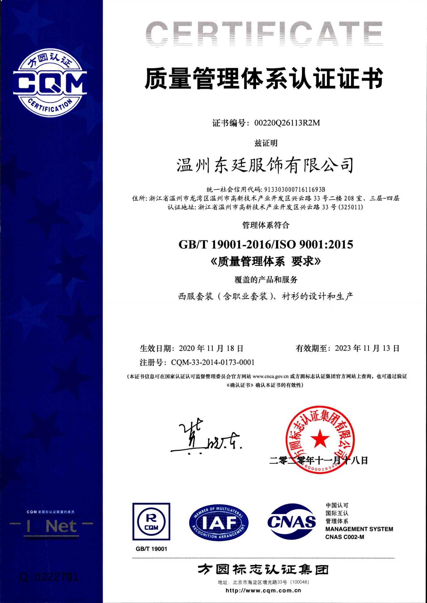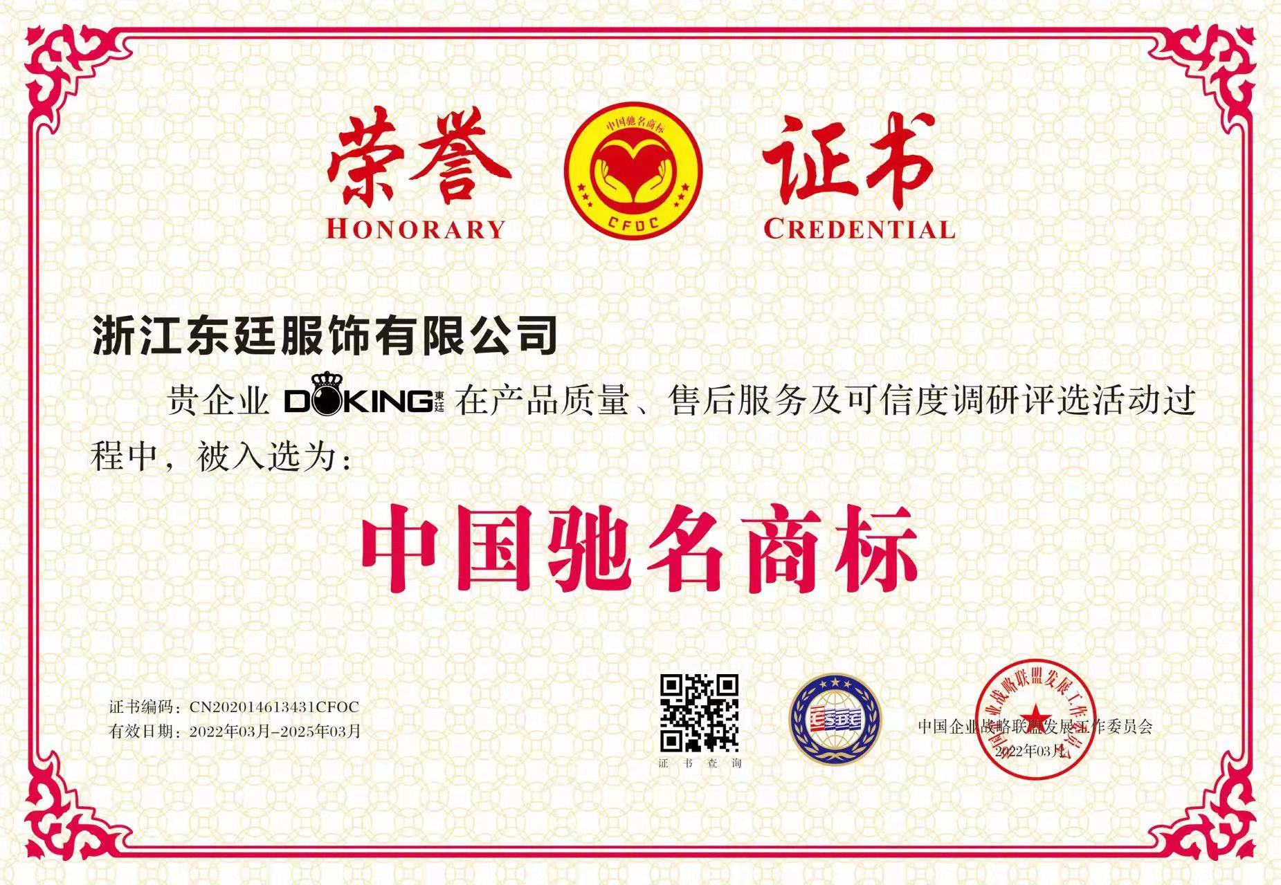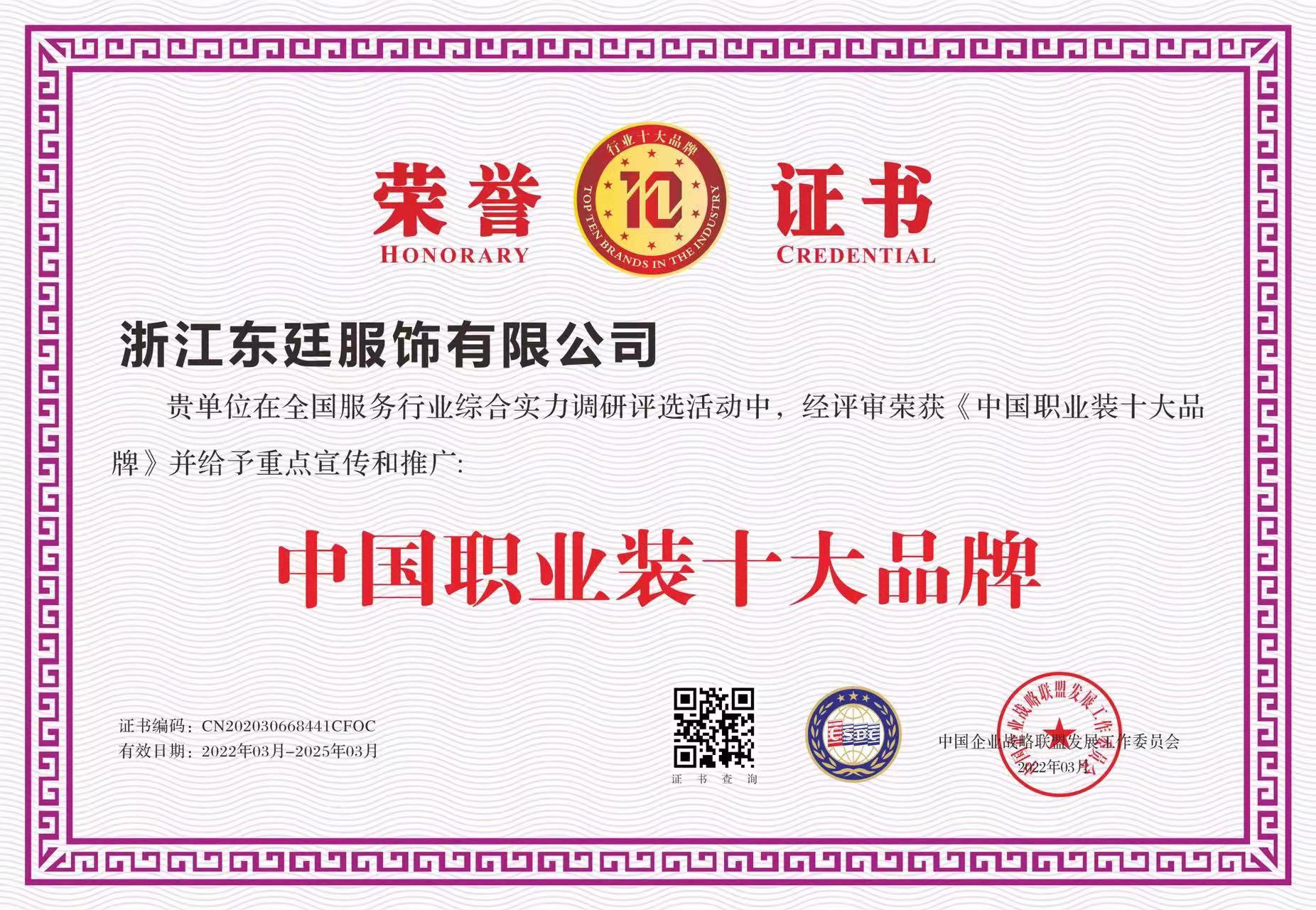 公司通過了ISO9001質(zhì)量管理體系認(rèn)證、ISO14001環(huán)境管理體系認(rèn)證、OHSAS18001職業(yè)健康安全認(rèn)證,國家綠色產(chǎn)品認(rèn)證。公司目前擁有15個(gè)發(fā)明專利和實(shí)用新型專利,2020年被評為“國家高新技術(shù)企業(yè)”、“浙江制造品字標(biāo)認(rèn)證企業(yè)”,“國家綠色產(chǎn)品認(rèn)證”還先后被評為“中國馳名商標(biāo)”、“中國名牌產(chǎn)品”、“中國職業(yè)裝十大品牌”、“AAA級信用企業(yè)”、“AAA質(zhì)量服務(wù)誠信企業(yè)”、“AAA級重合同守信用企業(yè)”、“資信等級AAA企業(yè)”、“國家3.15誠信企業(yè)”、“浙江省科技型中小企業(yè)”、“浙江省著名品牌”、“五星級售后服務(wù)單位”、““安全生產(chǎn)標(biāo)準(zhǔn)化一級企業(yè)”、“國家權(quán)威檢測合格放心產(chǎn)品”等榮譽(yù)。公司產(chǎn)品覆蓋高端職業(yè)裝團(tuán)購定制、高級個(gè)人定制等業(yè)務(wù),高品質(zhì)的產(chǎn)品和個(gè)性化的服務(wù)倍受客戶的青睞。